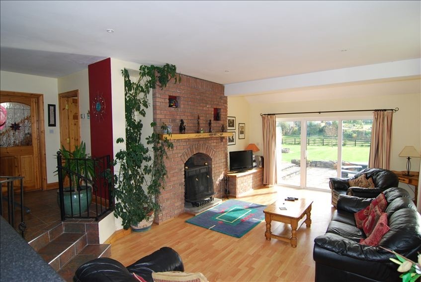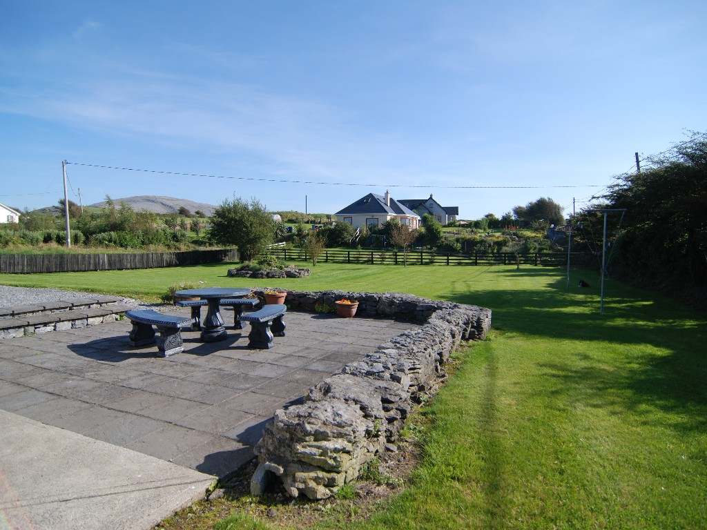 Extra large patio doors open out onto a large paved patio area and landscaped garden complete with table and gas bar-b-cue, making this an ideal place to relax and view the magnificent Burren landscape as the sun makes its way round this side of the house.